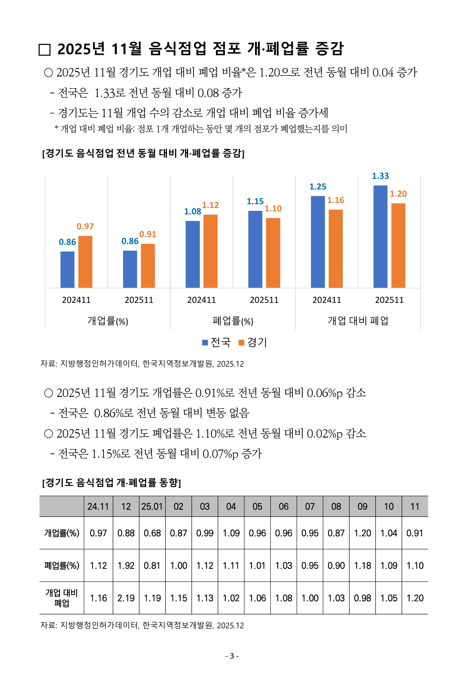 [월간 동향보고] 「2025년 11월 경기도 음식점업 소상공인 개·폐업 동향보고」
